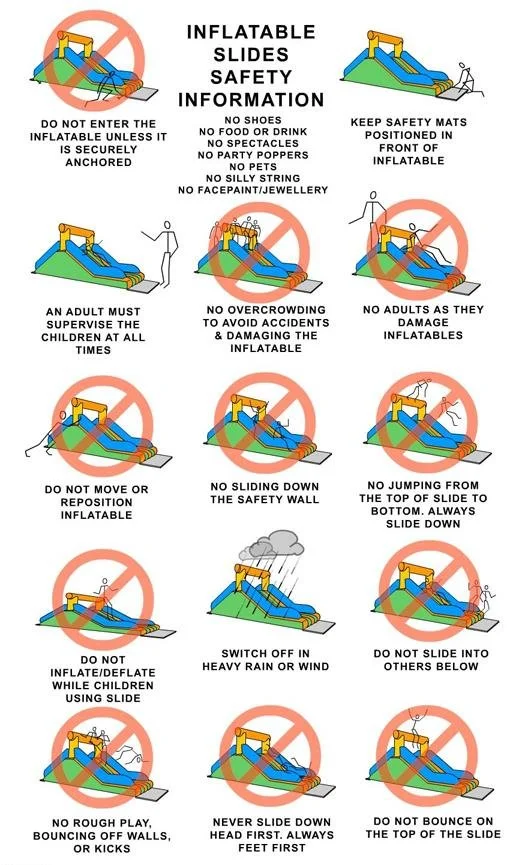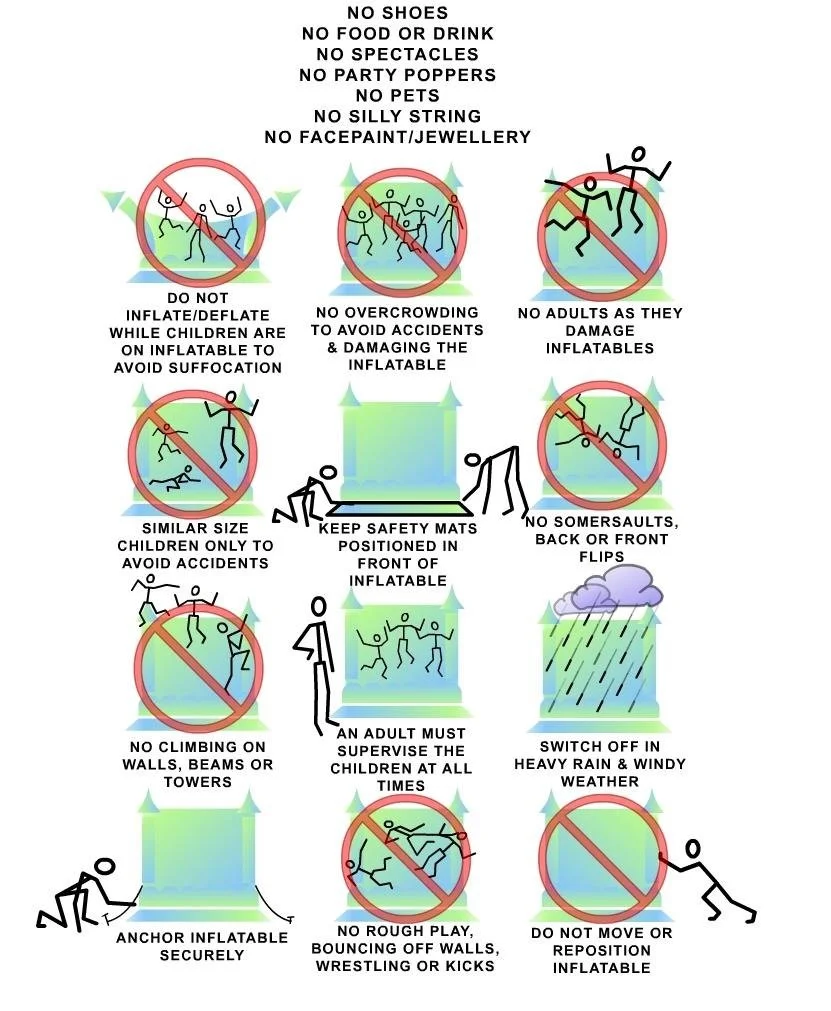 user of our products & inflatables must carry out a risk assessment(or call us immediately). This should identify the hazards associated with use of the inflatable and then implementing suitable and sufficient control measures to minimise risk of injury to persons on or in proximity to the inflatable.